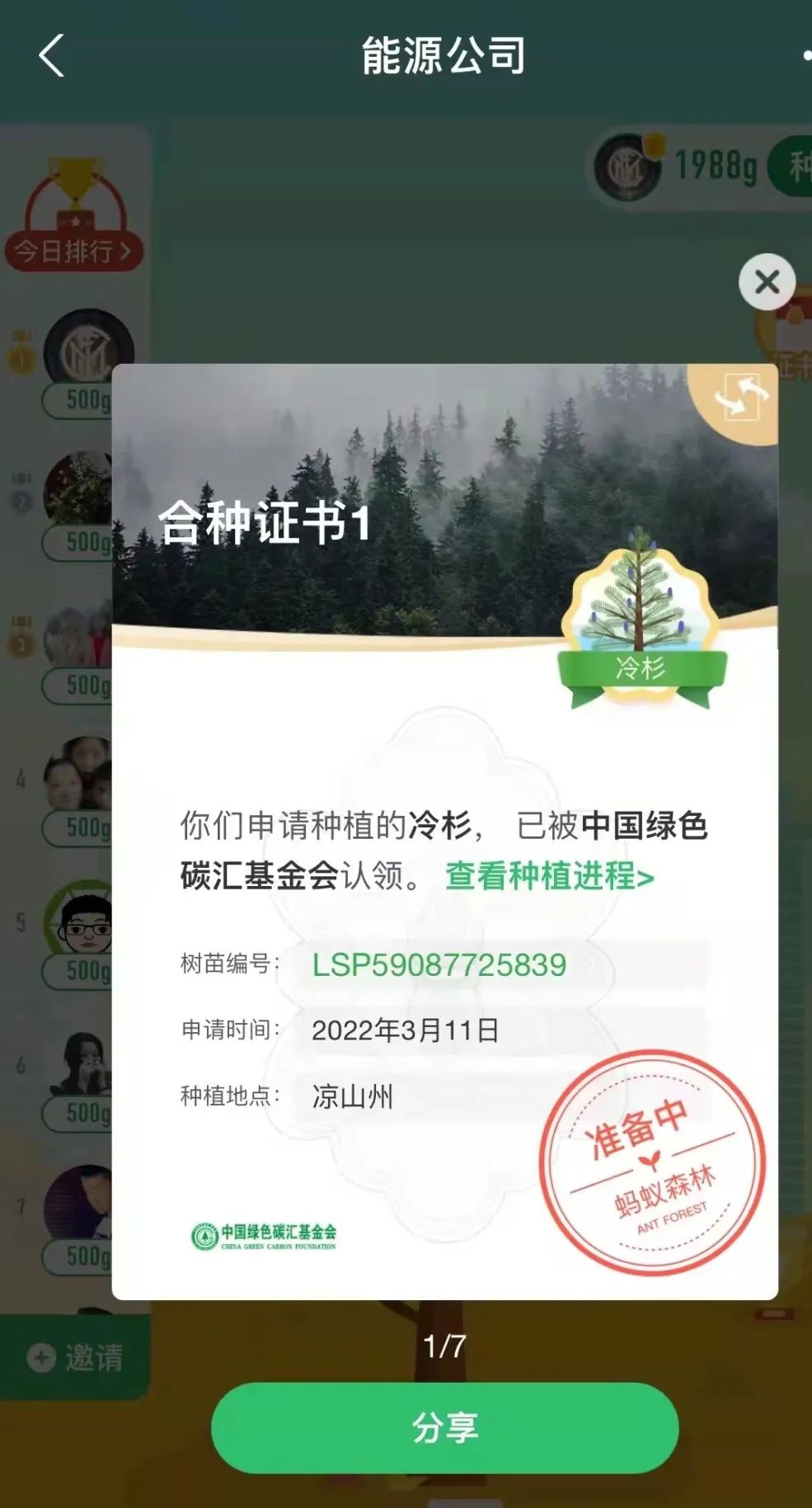 “一花一草皆生命,一枝一葉總關(guān)情。”早在2019年起,公司就通過支付寶螞蟻森林組建了一只“能源公司云種樹小隊”,如今隊伍人數(shù)越來越壯大,已有59位隊員,截止目前,在酒泉、大理、邯鄲等地,種下了冷杉、側(cè)柏、云杉、胡楊等7棵大樹。3月11日,在小伙伴的共同努力下,我們又種下了一棵冷杉樹,該樹被中國綠色碳匯基金會認領(lǐng),將種植到?jīng)錾街莸貐^(qū)。